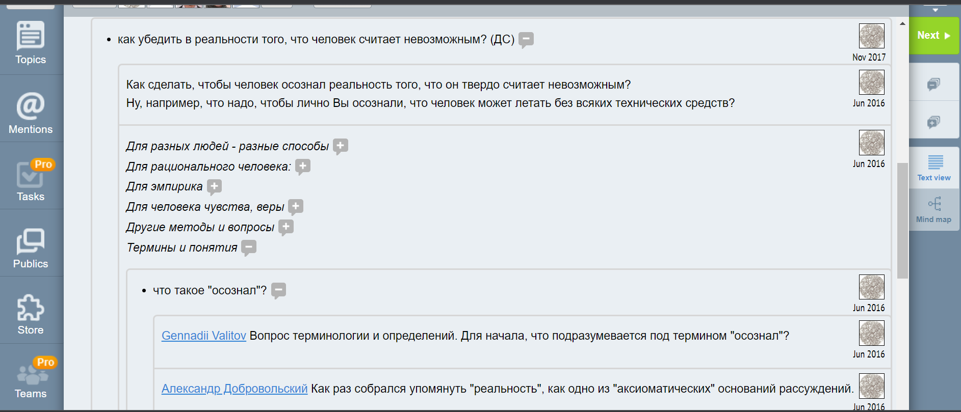 Когда было понято — а я повторяю, что это было понято довольно рано, — что реальное рассуждение и мышление развёртываются как-то иначе, нежели это фиксируют существующие логические схемы, тогда был поставлен вопрос, что представляют собой реальные механизмы мышления и где они лежат.